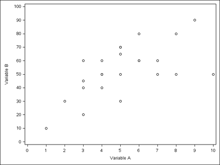 PROC SGPLOT; SCATTER X=A Y=B; XAXIS VALUES=(0 TO 10 BY 1) LABEL="Variable A"; YAXIS VALUES=(0 TO 100 BY 10) LABEL="Variable B" ; |